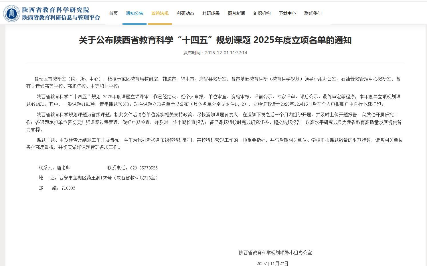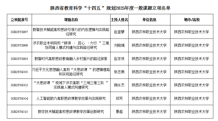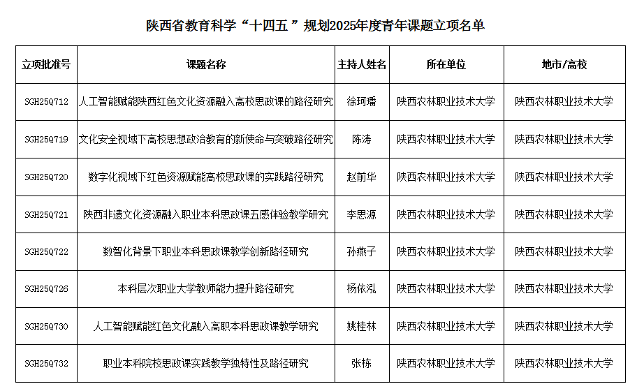 12月1日,陕西省教育科学“十四五”规划课题2025年度立项名单公布,马克思主义学院共获批15项。其中,一般课题7项,青年课题8项。自2021年陕西省教育科学“十四五”规划年度课题组织申报以来,学院连续5年共计获批53项。
