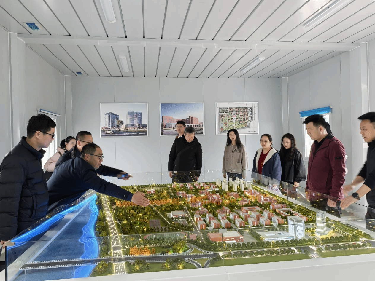 在基建处相关负责人的讲解下,大家先后参观了大学生文体中心、综合服务中心、校医院、理实一体教学楼、产教融合中心、学生公寓、学生食堂及体育操场等设施,详细了解了滨河校区一期的功能区划;随后,大家驻足观看校区沙盘,对学校滨河校区的发展蓝图有了更直观、更深刻的感受。