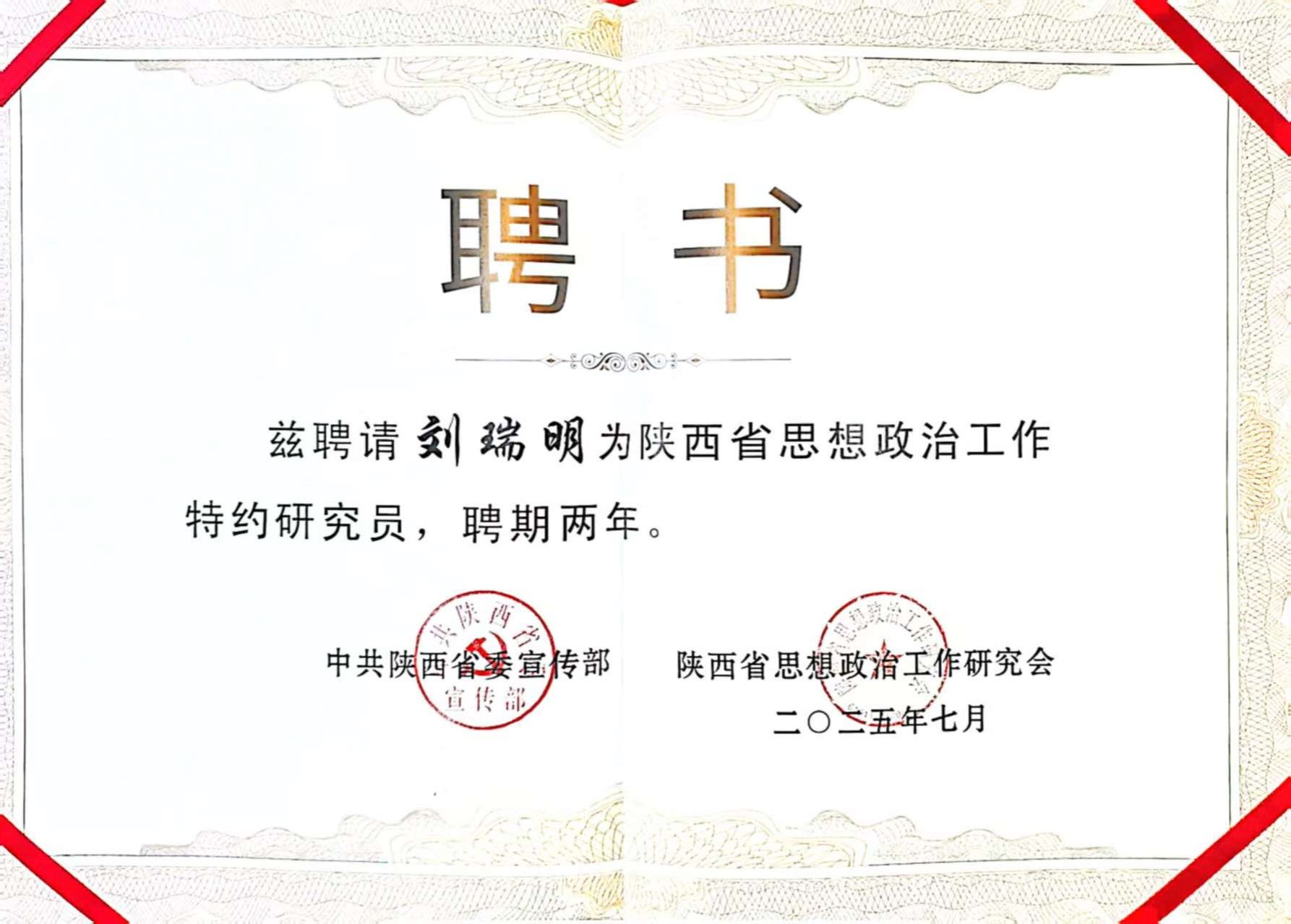 近日,陕西省委宣传部、陕西省思想政治工作委员会联合下发了陕西省思想政治工作特约研究员聘任的相关通知,我校党委副书记、马克思主义学院教授刘瑞明受聘“陕西省思想政治工作特约研究员”,聘期两年。