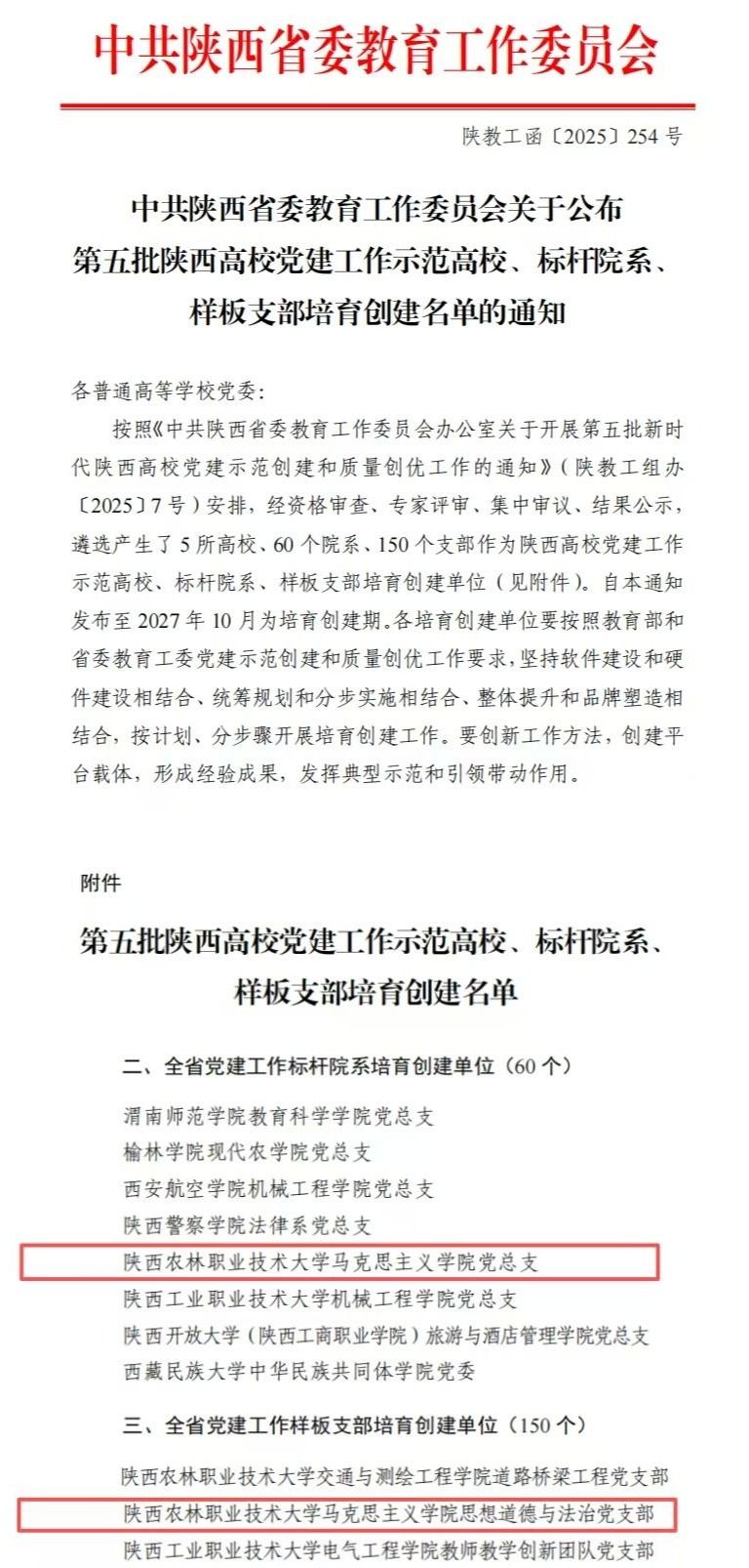 近日,陕西省委教育工委公布第五批全省高校党建工作示范高校、标杆院系、样板支部培育创建单位名单,马克思主义学院党总支入选省级党建工作标杆院系培育创建单位,马克思主义学院思想道德与法治党支部入选省级党建工作样板支部培育创建单位。两项荣誉的获得,是学院长期坚持以高质量党建引领业务高质量发展、深化党建与业务双融双促双提升的重要成果,标志着学院党建工作取得历史新突破,迈入高质量内涵式发展新征程。