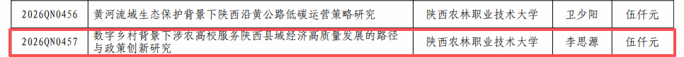 近日,陕西省社会科学界联合会公布了2026年度陕西省哲学社会科学研究专项一般项目、青年项目立项结果。马克思主义学院青年教师李思源主持的《数字乡村背景下涉农高校服务陕西县域经济高质量发展的路径与政策创新研究》获批青年项目立项。
