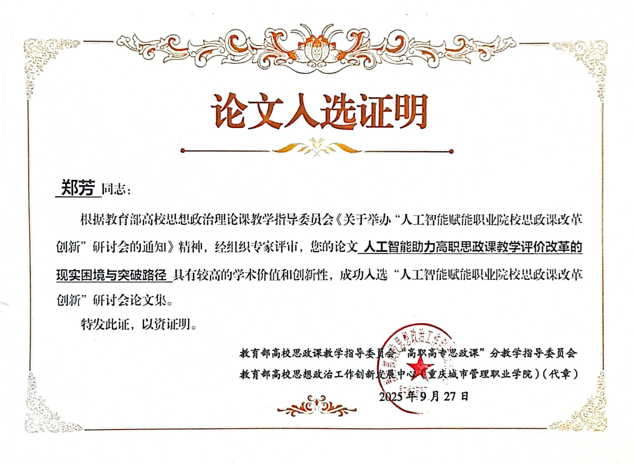 前期,经教育部高校思政课教学指导委员会“高职高专思政课”分教学指导委员会组织专家评审,郑芳撰写的《人工智能助力高职思政课教学评价改革的现实困境与突破路径》成功入选研讨会论文集。