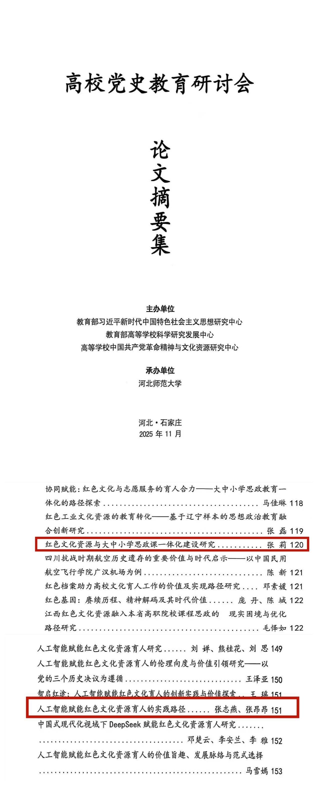 前期,经教育部高等学校科学研究发展中心组织专家评审,张莉撰写的《红色文化资源与大中小学思政课一体化建设研究》,张志燕撰写的《人工智能赋能红色文化资源育人的实践路径》成功入选研讨会论文集。